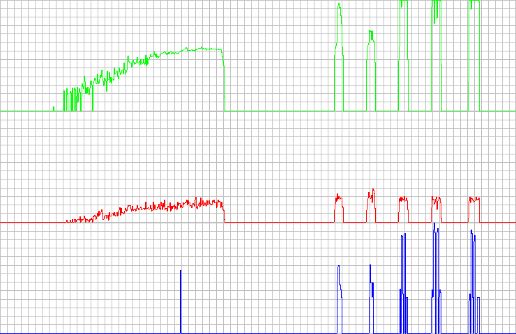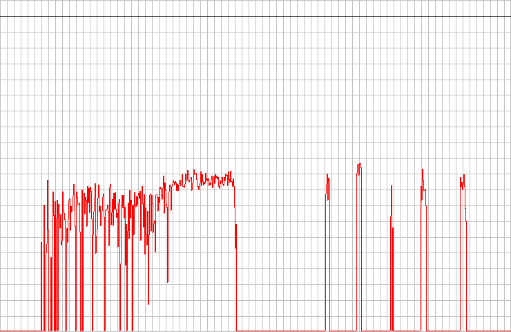 This is the result of a Plextor CD-R PX-W2410A at full maximum speed. As clearly visible, it detected quite a number of c2 errors (and it looked as the drive lowered speed itself twice). The error table of this extraction (as using a different test CD), can be seen here.